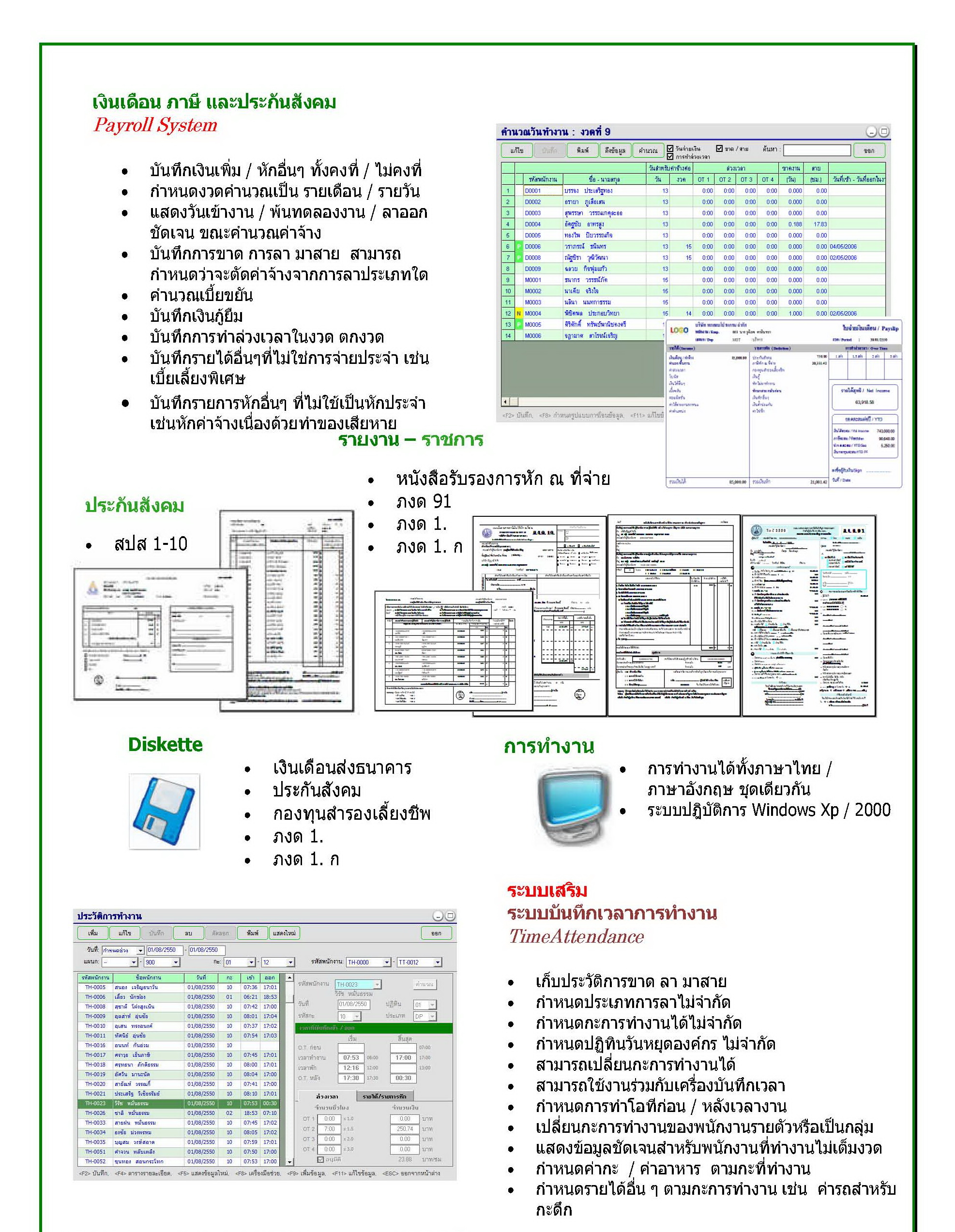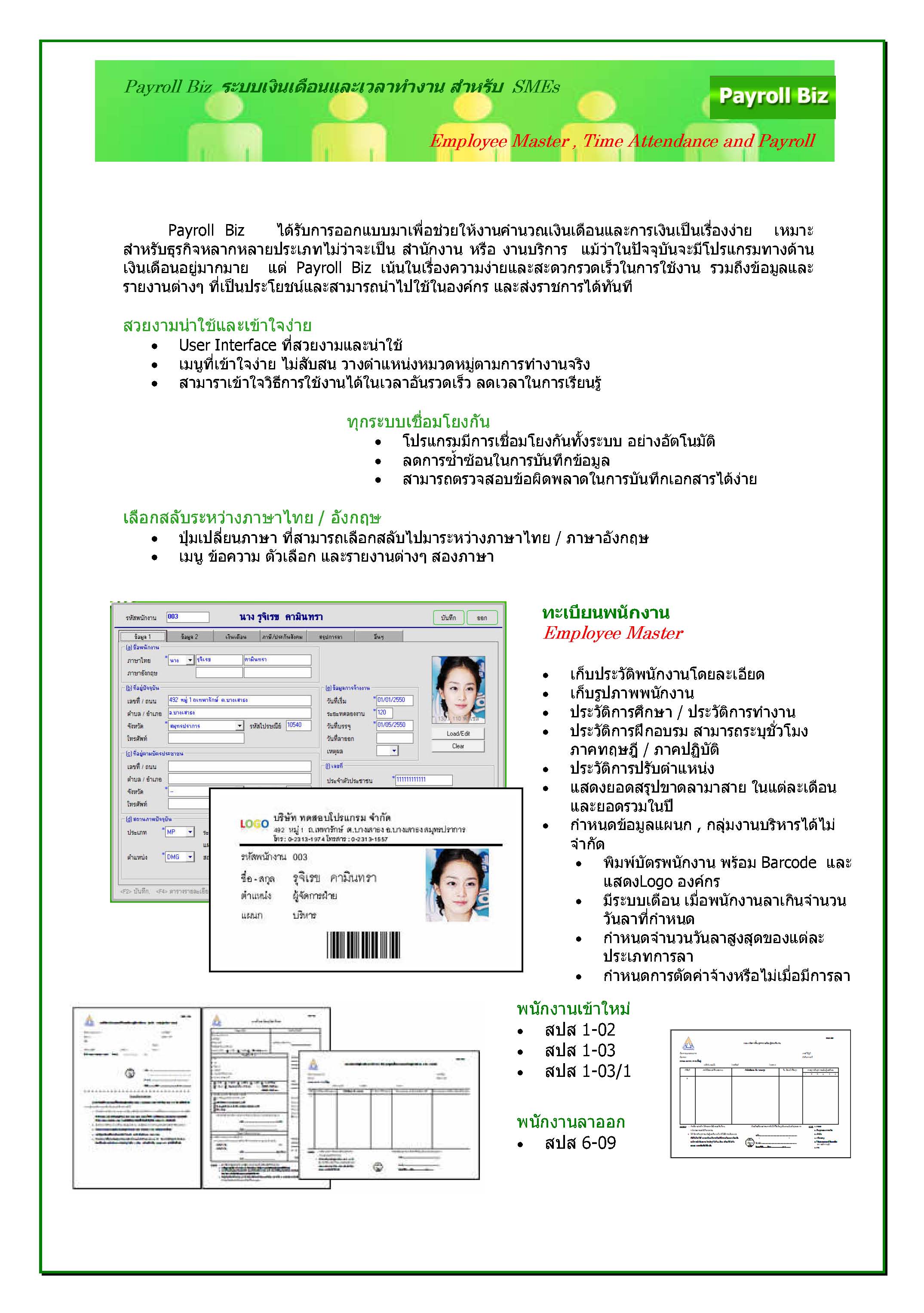 โปรแกรม Payroll Biz สำหรับจัดการระบบเงินเดือนและบันทึกเวลาทำงาน เหมาะกับธุรกิจหลากหลายแบบ ไม่ว่าจะเป็นสำนักงาน หรือ งานบริการทั่วไป ที่มีการเข้างานแบบปกติและเน้นเรื่องการคำนวณเงินเดือนโดยสามารถคำนวณเงินแยกเป็นรายคน จัดทำหนังสือสัญญาเงินกู้ หนังสือรับรอง คำนวณภาษีและประกันสังคม ทั้งแสดงรายงานอย่างละเอียดทั้งหมดตามรายการต่าง