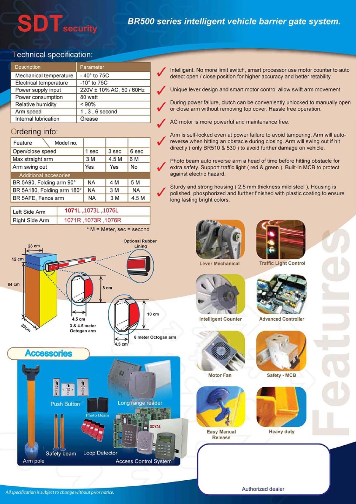 - ความเร็วในการเปิด-ปิดไม้แขนกั้น : 1, 3,6 วินาที (ตามความยาวแขนไม้กั้น)